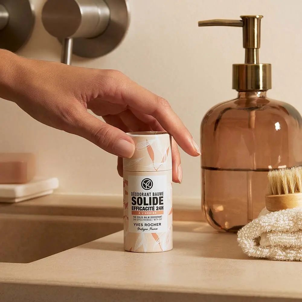 Le déodorant baume solide est efficace 24h* contre les mauvaises odeurs et ne laisse pas de trace sur les vêtements.