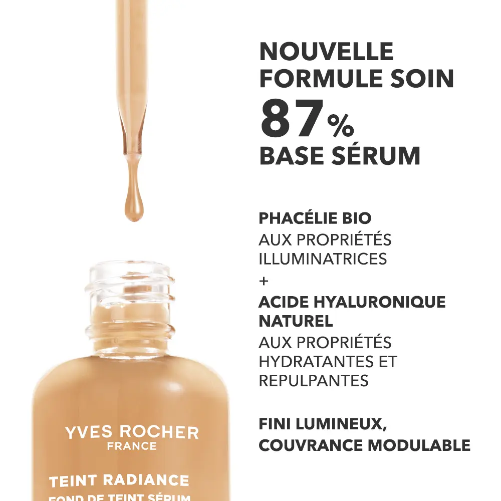 Teint Radiance le nouveau fond de teint sérum, illumine, repulpe et hydrate pour révéler chaque jour une peau plus éclatante.