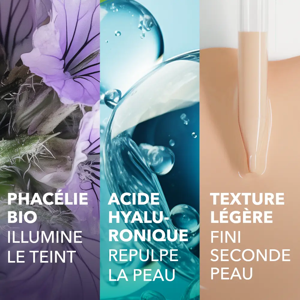 Sa formule soin composée à 87% de base sérum est enrichie d’un complexe d’actifs botaniques. Elle associe la phacélie bio qui illumine le teint, l’acide hyaluronique d’origine naturelle qui repulpe la peau, et l’eau de camomille hydratante pour une action soin visible jour après jour.
