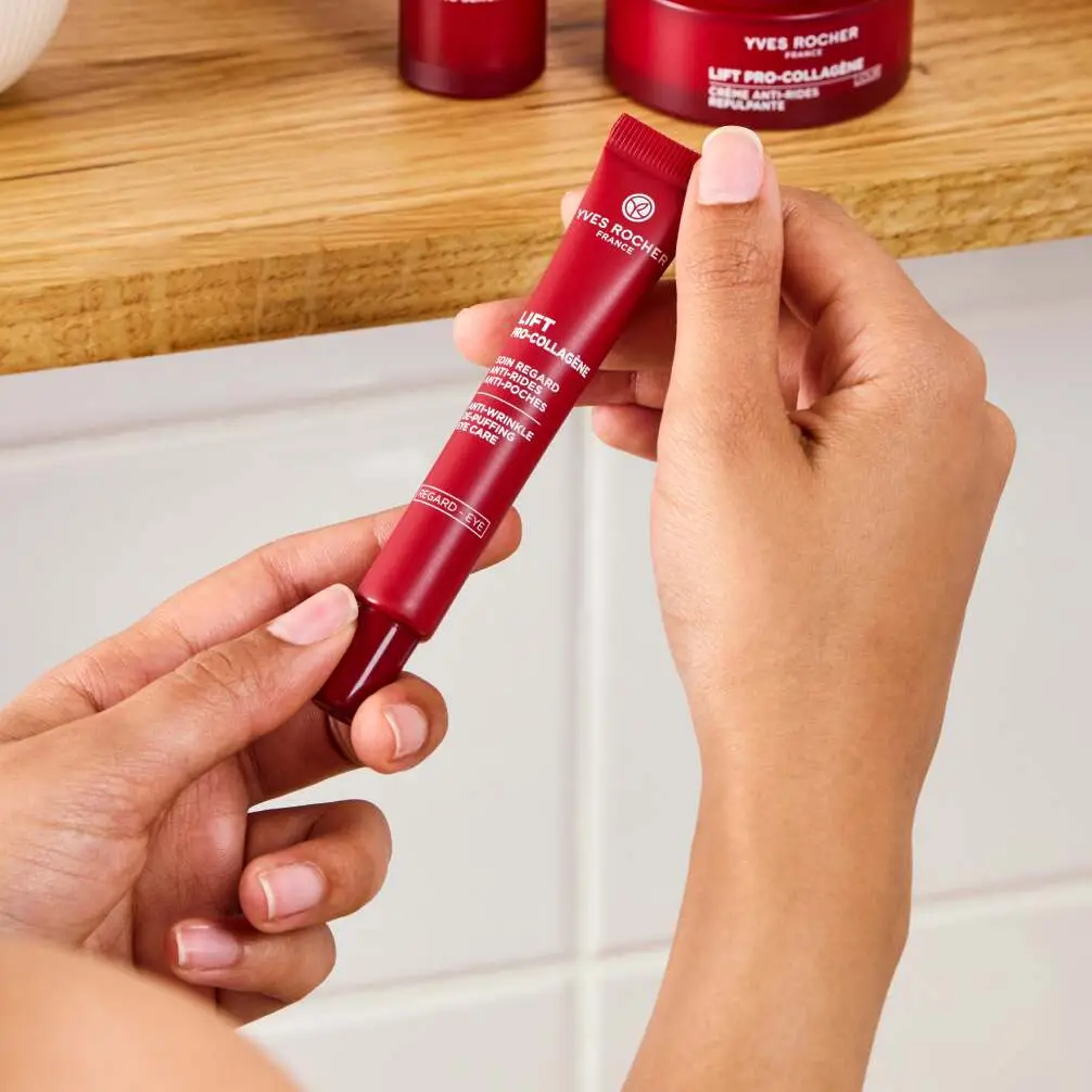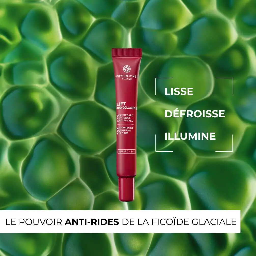 Le Soin Regard Anti-Rides Anti-Poches Lift Pro-Collagène corrige visiblement les poches et réduit les rides et ridules, pour un contour de l’œil instantanément plus lissé et plus lumineux.