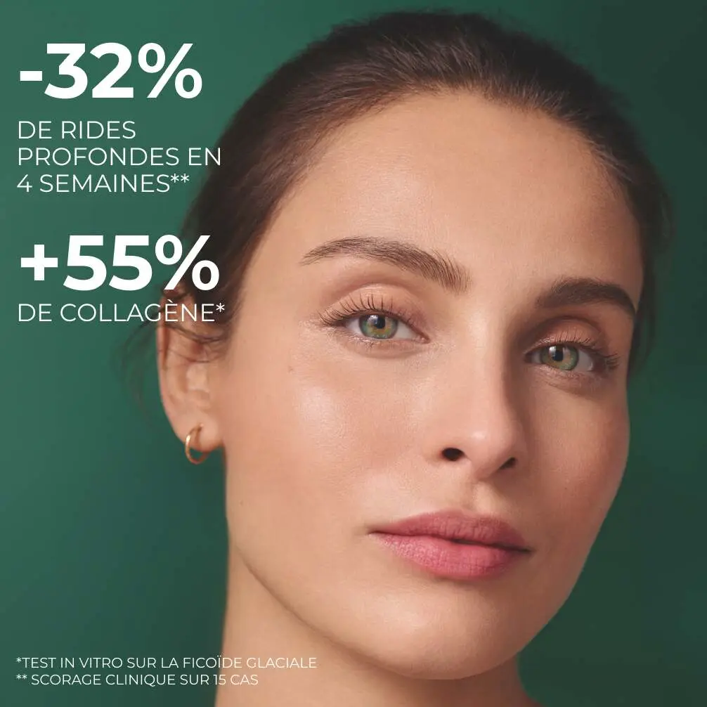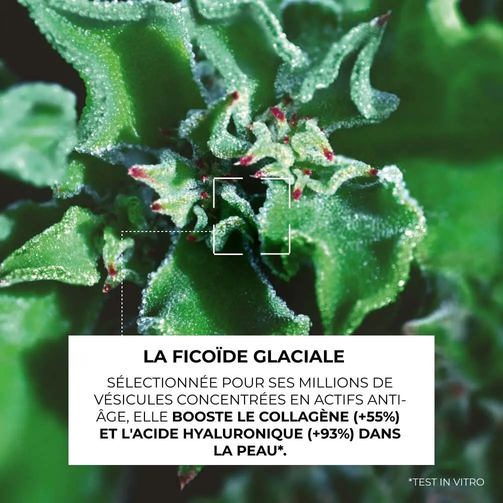 Sa formule hautement concentrée à 4% en Ficoïde Glaciale est associée à du Collagène Végétal et de l’Acide Hyaluronique d’origine naturelle pour une efficacité anti-rides renforcée.