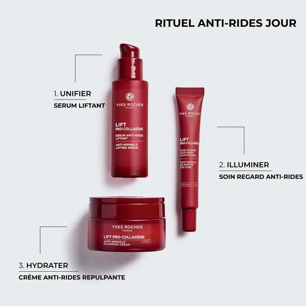 Le Sérum Anti-Rides Liftant Lift Pro-Collagène lisse et corrige les rides même profondes pour une peau instantanément plus souple et repulpée.